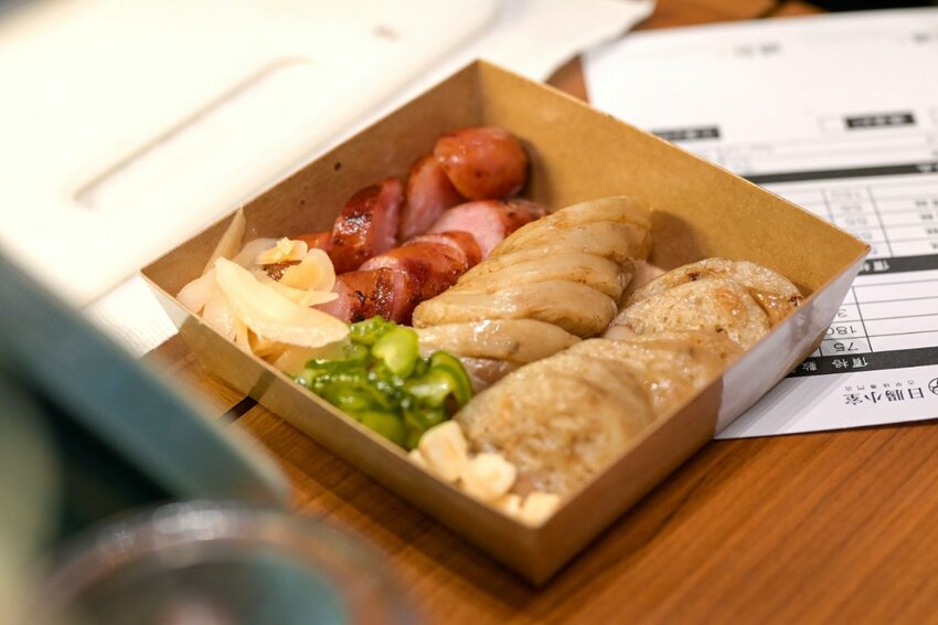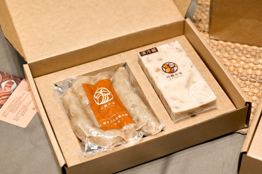 現場販售遵循古法製作的台式小吃,大腸包小腸很台式卻很親切的組合,配大蒜與黃瓜薑片夠台夠蒜夠味,也有販售年節真空禮盒。