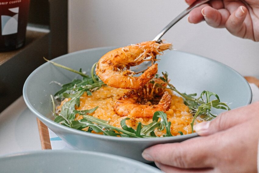 香草奶油南瓜鮮蝦燉飯:燉煮的超綿密南瓜燉飯配上兩尾調味過咖哩鮮甜白蝦,蝦肉緊實彈牙,燉飯南瓜超級濃郁,喜歡吃南瓜可以選這款。
