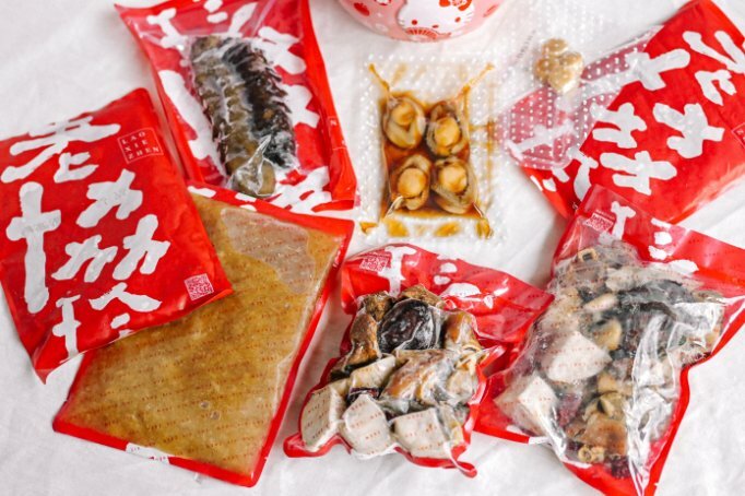 兩包綜合食材包內有豬腳丁、 排骨、菱角、 栗子、魚皮、 炸芋頭、香菇、紅棗等,我覺得最貼心就是真材實料有甚麼都清楚看見,最近去朋友家聚餐吃佛跳牆是罐頭裝,打開來甚麼材料都分不出來有點傻眼(攤手)。