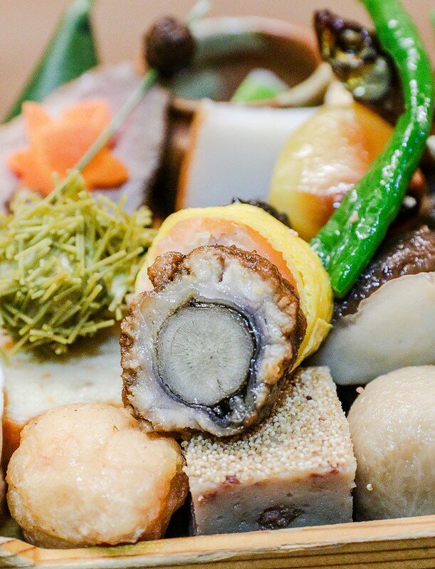 只好照片友人的吃法從眾多配角中的主角「宇治丸」說起;宇治丸這個名字從大阪の長者の話が 「宇治丸物語」而來,在日本国語大辞典中也有熟細的記載。宇治丸這道料理,約莫出現在江戶時代(1603年-1867年)前的山城国(京都府),是當時宇治明文記載的名物,主要的食材是宇治盛產的鰻魚,將かばやきなど(蒲燒)後的鰻魚捲成圓(丸)狀,取名為「うじまろ」,此料理也在御湯殿上日記(京都御所・ 清涼殿内「御湯殿」女官の日記)出現過。而後的宇治的京料理又在當中添加了牛蒡,成了近似印籠煮(中空中空食材填充料理的統稱)也就是今日宇治丸的模樣,就友人的說法「宇治丸」不止出現在京都的高級料理亭,平常人家節慶祝日時也會出現在餐桌上。實際上的味覺就是蒲燒鰻魚混搭牛蒡,味道端沒有太多值得一提,倒是兩者鮮明對比的口感頗耐人尋味。