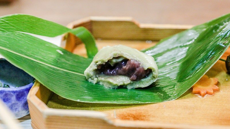 我不是京都人,所以不是每樣都吃得懂,也不敢搬門弄斧,加上實在太多樣也不好意思一樣一樣拍...,但當中印久最深的是這個外層是抹茶口味,像麻吉又像草仔粿,以竹葉包著的點心,裡面則是兩種不同口感的紅豆餡,化口又綿細,淡淡的抹茶咀嚼後茶香,真是好吃的亂七八糟。