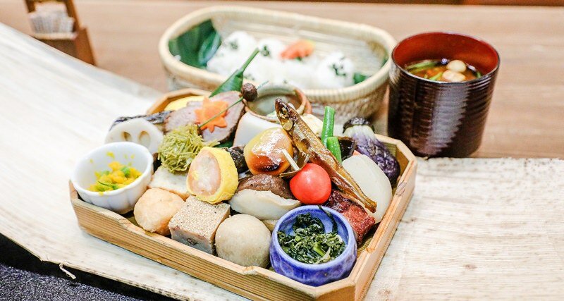 透過官網的那張照片比較能清楚的看出,宇治丸便當上來時外面是以竹葉包著像是竹藍般的野餐盒,光是視覺上就覺得好有fu。除了主角「宇治丸」外,還有堆積如小山的25種御數 (おかず),用大家比較能聽懂的就是京都懷石料理的小菜,這些料理常常出現在溫泉飯店的會席料理前菜中,有趣的說法是把很多很多配角集合在一起變成了主角,讓人看得是目不暇給,完全不知道該從那一樣吃起。