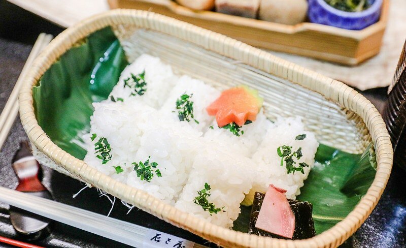 除了那25道絕品宇治京料理外,主食是俵結びのおにぎり(米俵狀的飯糰),但一般在日本常見的外層還會包上海苔,這裡改用碾碎的宇治茶葉,吃起來漂散著淡淡的茶香,覺得這米飯吃起來特別有黏性,好奇問了一下,說是秋田的米,就不知道是不是小町米。上面還放了兩個裝飾用的小漬物,放在竹籃裡一整個吸睛許多。