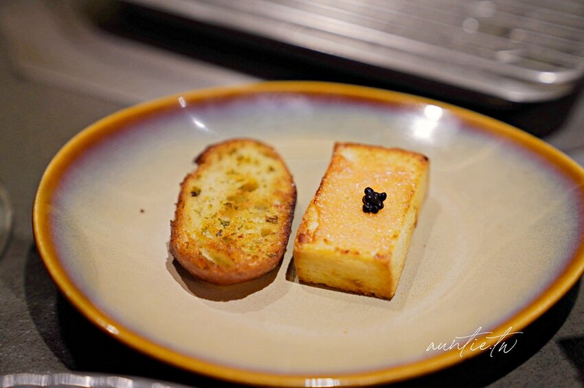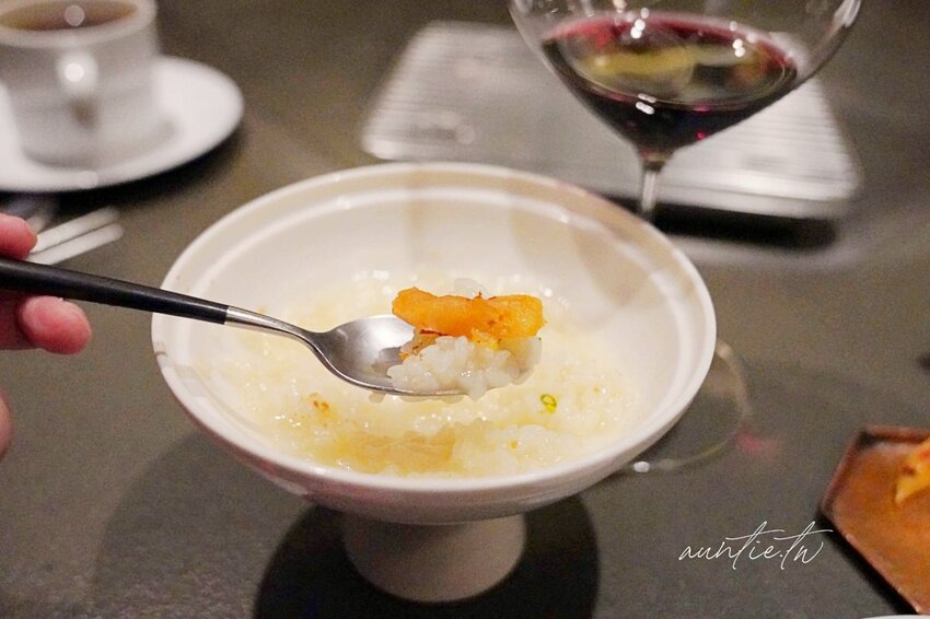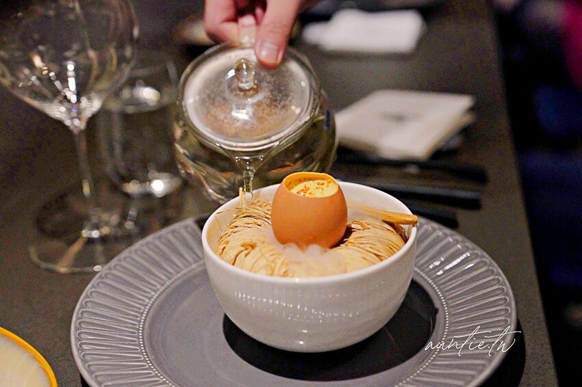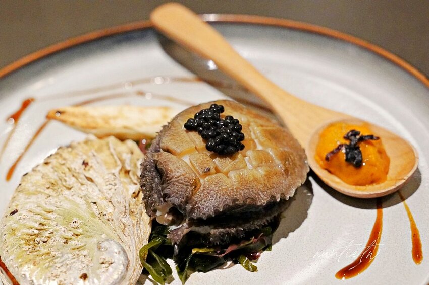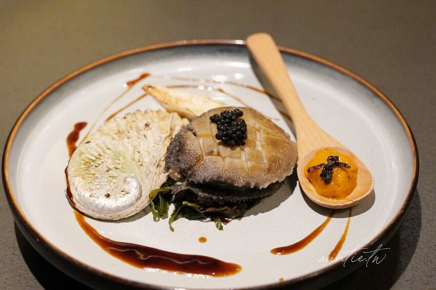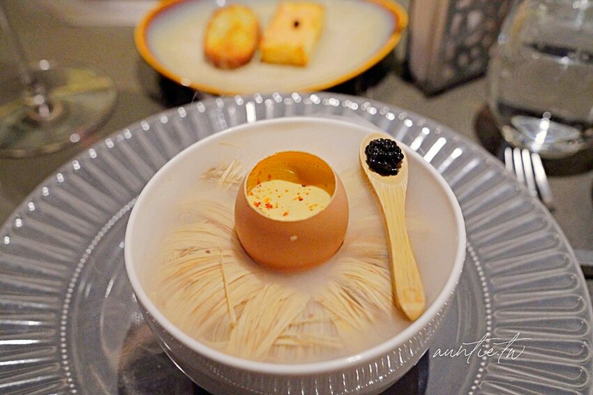 上桌前加水營造成雲霧繚繞的感覺,看起來很仙的蛋殼。裡頭加了魚子醬以及海膽與蒸蛋,吃起來充滿蛋香與海膽的大海氣味,味道很不錯,吃得太認真還順手捏破蛋殼有點囧。