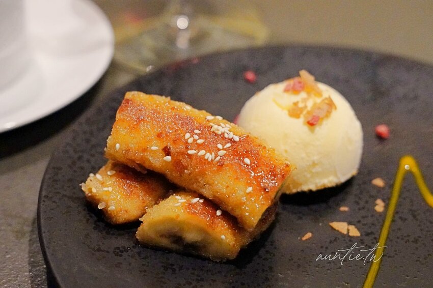 香蕉切片炙燒成恰恰的顏色,看起來很簡單但很好吃,擺盤可以再精緻些,近四千的價位甜點上烤香蕉有點弱。