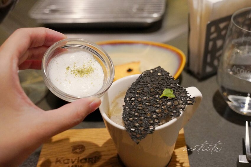 蕈菇濃湯搭配像黑蕾絲般的脆片,可以加入濃湯中一起喝,泡泡還是用另外一個小玻璃盅承裝著,味道就是清爽蕈菇湯的味道,沒有太濃烈。