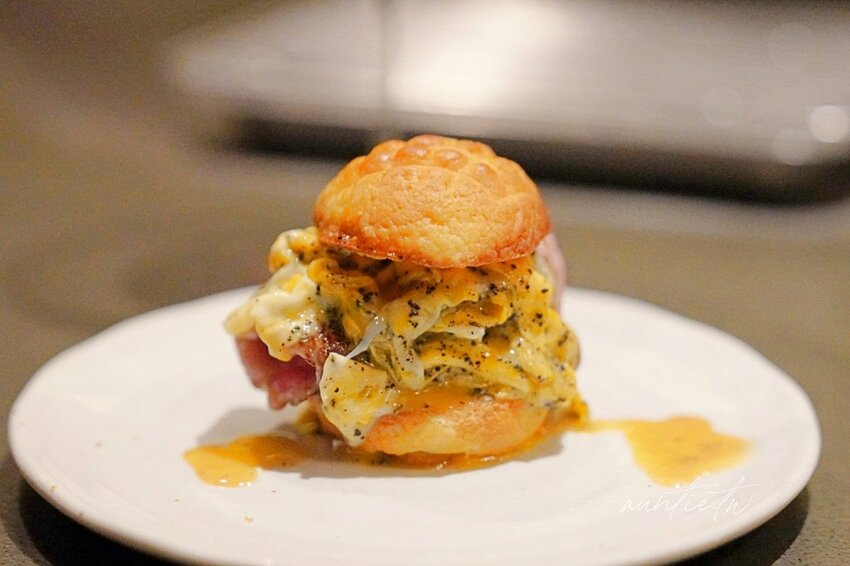 好喜歡這一道,迷你品的菠蘿包,小巧可愛,菠蘿包外皮脆脆的,鹹甜的味道我很愛,中間則是松露滑蛋以及剝皮辣椒、莎朗牛肉片,是外表跟味道都很邪惡的一道小品,比主餐驚豔,今日最喜歡就是你了!