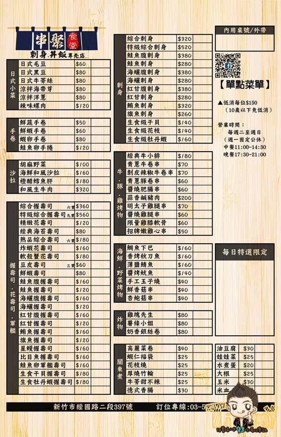 菜單的部分為串聚食堂,多了刺身與丼飯系列,同時還有串燒、生魚片、握壽司等等,轉型為日本料理店又有多樣化的美食。