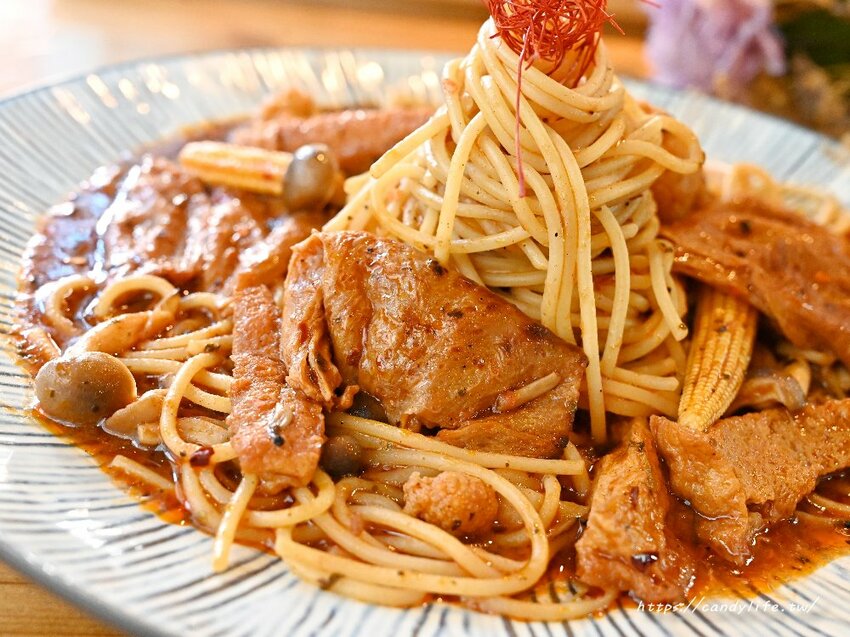 醬汁採用主廚特製的番茄醬加入花椒及乾辣椒,入口除了番茄的酸甜滋味,還多了花椒的香麻及乾辣椒的香辣滋味,辣度大概是小辣左右,裡頭除了採用豆皮製作而成的素牛肉,還有菌菇、花椰菜及玉米筍等豐富配料,喜歡吃辣的朋友可以試試這道唷