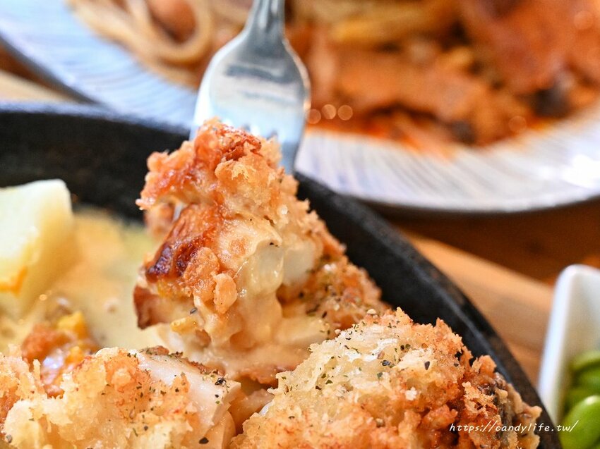 將杏鮑菇先醃過,接著裹上麵衣下去炸至金黃酥脆的模樣,外酥內嫩,吃起來相當juicy,除了杏鮑菇本身的香甜,還多了濃郁的起司香