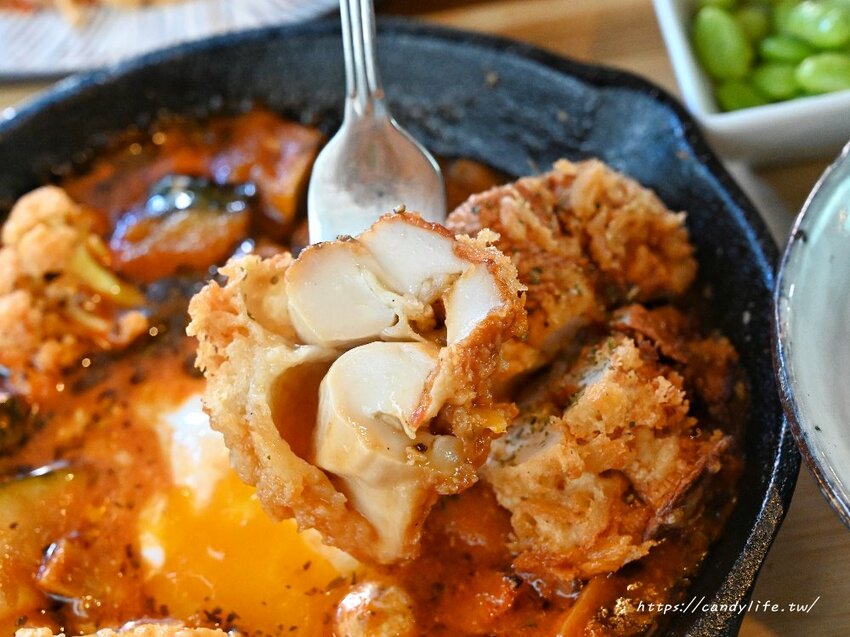 這道香煎蘑菇cheese豬排鑄鐵鍋是正統的夏卡蘇卡口味,基底以大量蘑菇、番茄及蔬菜下去燉煮,醬汁非常濃郁,裡頭的cheese豬排一樣是採用杏鮑菇及乳酪絲製作而成,搭配櫛瓜、花椰菜、馬鈴薯、蘑菇等配料,中間還打上一顆水嫩嫩的水波蛋
