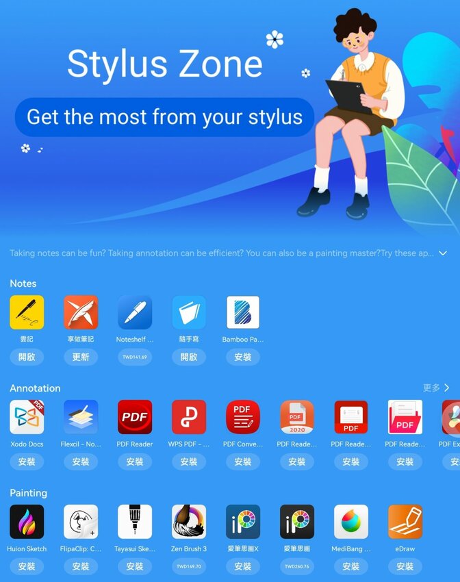 除了預載的華為筆記本應用程式,在桌面的「手寫筆應用程式專區」有彙整更多的手寫筆應用程式提供選擇性地安裝。