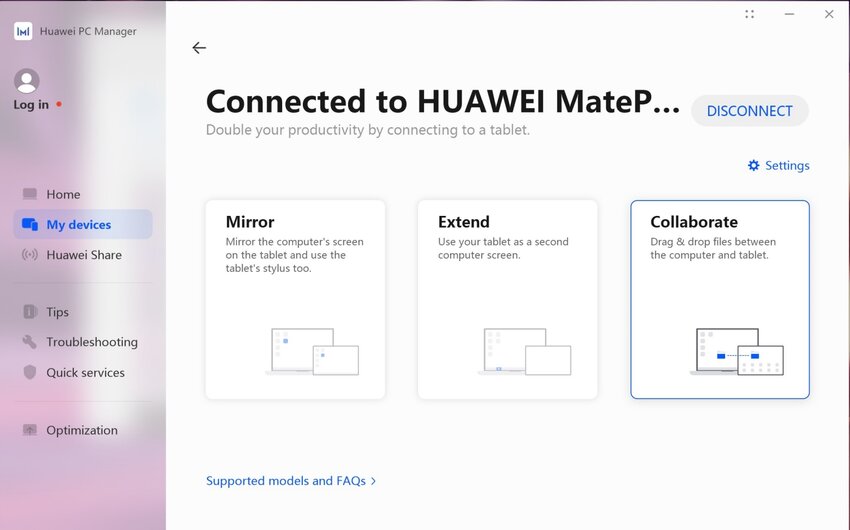 在華為筆電右下角啟動 “HUAWEI PC Manager”,即可開始使用多屏協同功能,主要有三大功能:鏡像、拓展、共用,建構完整生態系統,給用戶最佳的跨設備體驗,將平板與電腦連接後,易於銜接手上正在處理的資料。