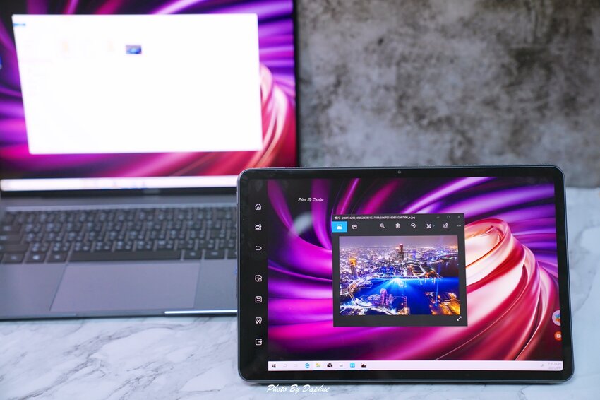 在拓展功能部分,你可以將筆電內容部分投送到平板,把筆電當成平板的延伸螢幕。在筆電上打開特定軟體工作時,在平板上打開另一個 APP作為參考用途。
