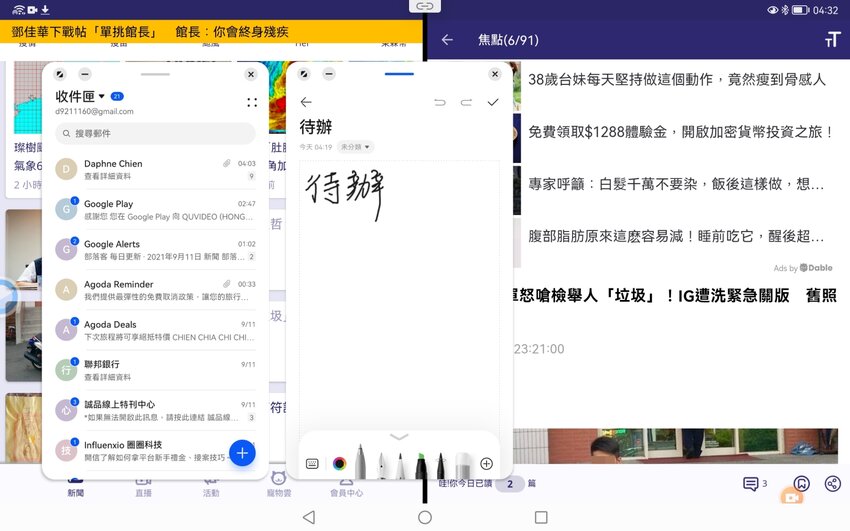 多視窗應用最多支援 4個 APP 同時使用,你可以一邊追蹤焦點新聞,一邊收發郵件,再一邊做筆記,多工處理工作。