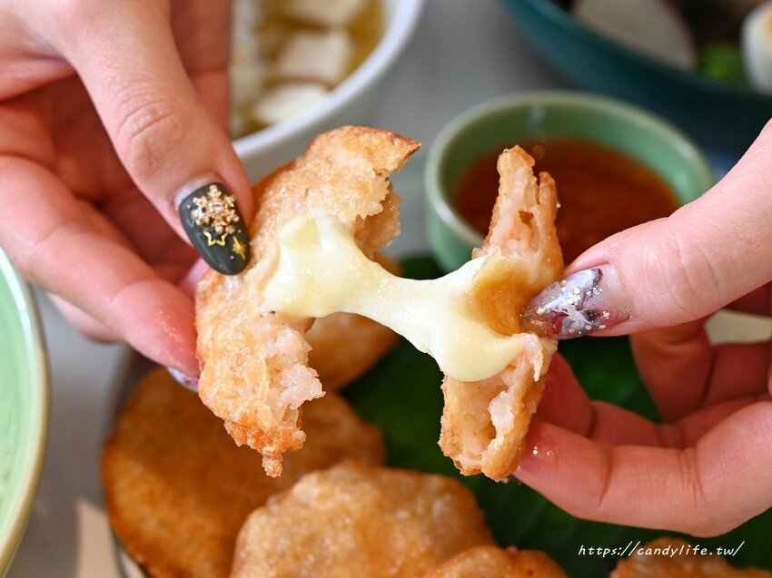 泰式月亮蝦餅很常見,但裡頭加了起士倒是很少見,將泰式月亮蝦餅中加入了馬茲瑞拉起士,熱熱吃可是ㄟ勘西的