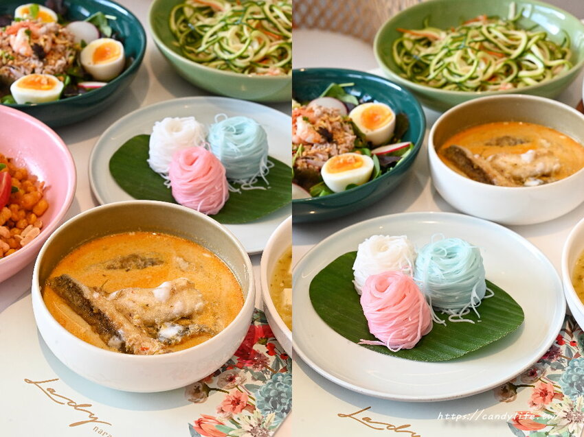 旁邊的三色米線分別是白色原味、粉色紅麴及藍色蝶豆花,吃的時候直接將米線放入咖哩中攪拌吸附醬汁就可以享用囉
