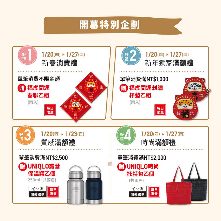 天天送單筆消費滿NT2,000,贈UNIQLO時尚托特包乙個(每日限量) - 網路商店門市取貨好禮1/20-1/27