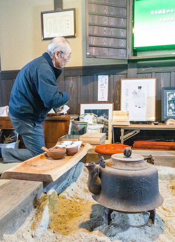 據說是永谷宗円後人的老爺爺,除了幫大家簡單解說影片的歷史和故事外,還親自操刀泡茶給我們喝,我不誇張以前我一點不愛喝日本的綠茶、煎茶,但那天喝過老爺爺沖的茶後,一整個大大改觀,老爺爺說茶不可以用高溫直接沖,而是要用略低(70度左右),緩緩而茶,如此茶才不會過於苦澀,且會有回甘的清香。回到台灣卻一直找不到類似的風味,直到後來有朋友送我「健司X辻利」的煎茶,那微苦甘醇的記憶才從新拾得。