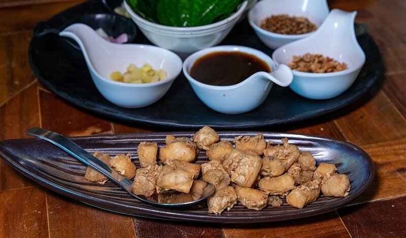 倒是搭配的這一盤我很喜歡,一開始以為是前幾天不少餐廳也出現過的豬油渣,吃了一塊才發現是炸魚塊,單吃或是混著那些調味料都很棒,滿滿泰式炸魚的油香。