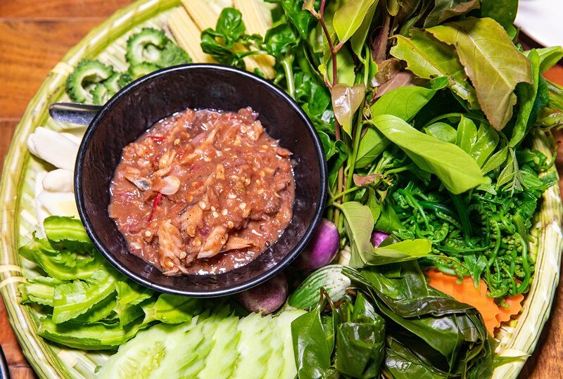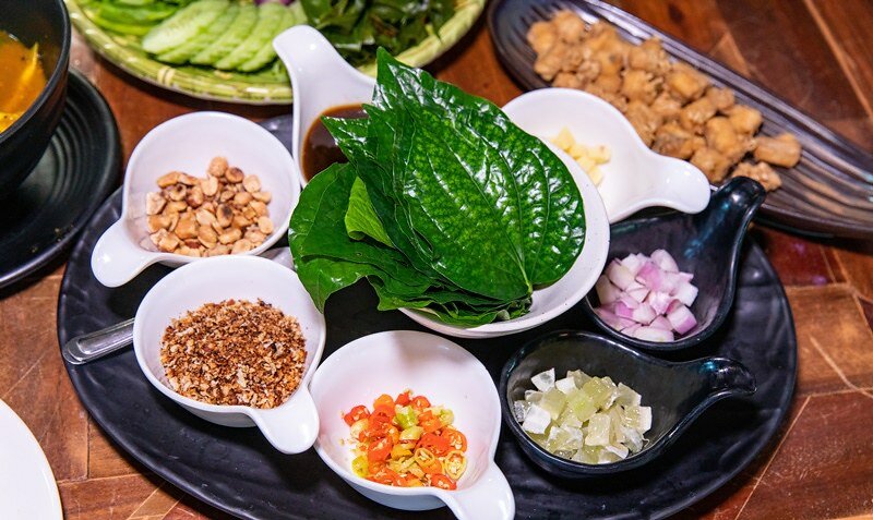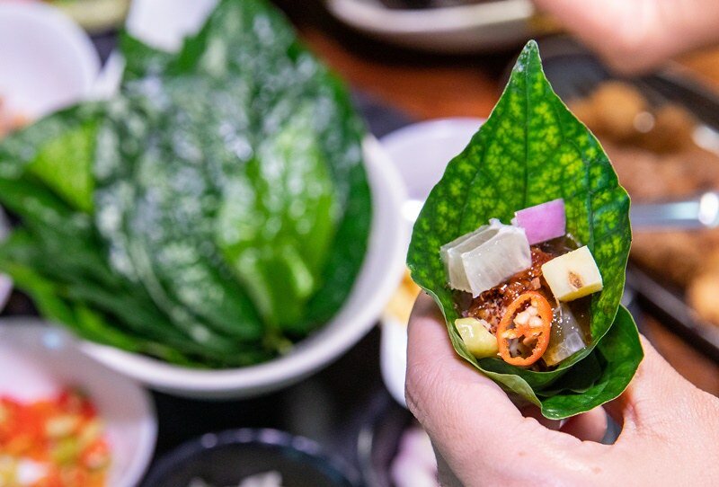 這道料理幾乎是這次我們在普吉、攀牙每家餐廳都會有的泰南前菜,由略為不同的調味料,同樣不盡相同的葉子,和不同魚肉、內臟的醃漬品組成。