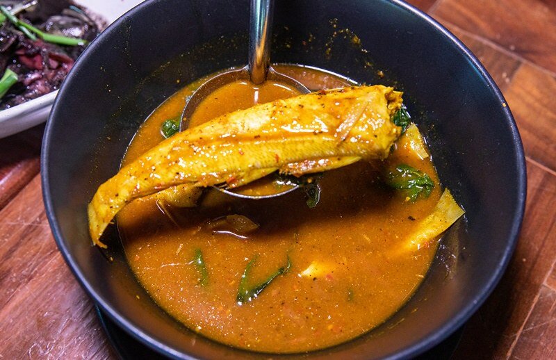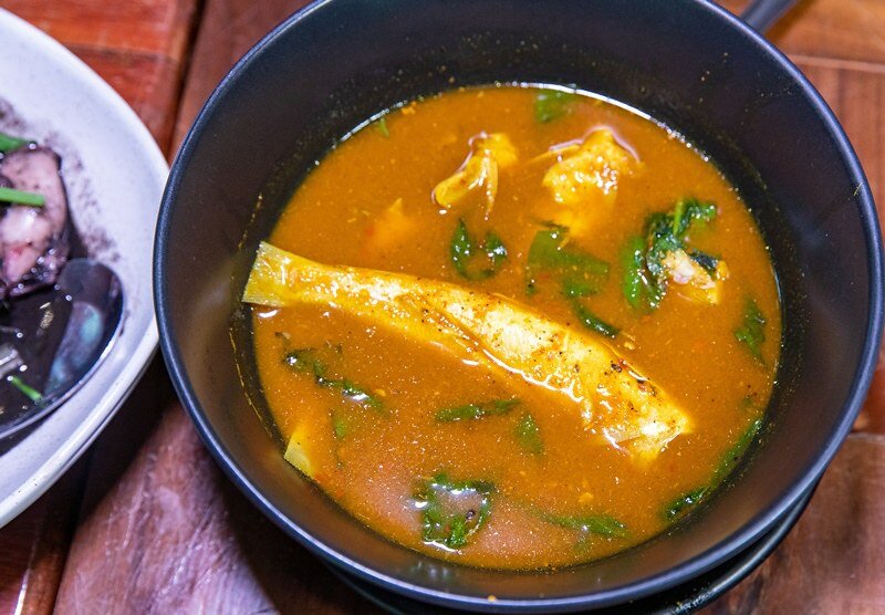 泰南料理除了深受中國福建、印度的影響外,也能嚐到新加坡、馬來西亞的影子,尤其是檳成、馬來甲的娘惹料理,而這濃濃的魚湯便很有那酸辣的滋與味,當中的河魚本來不敢吃,但在友人的推薦下吃了一口,沒想到意外沒啥腥土味,比想像來的強的酸與辣不斷勾起食慾,當真蠻涮嘴的,就是魚的細刺多了些。