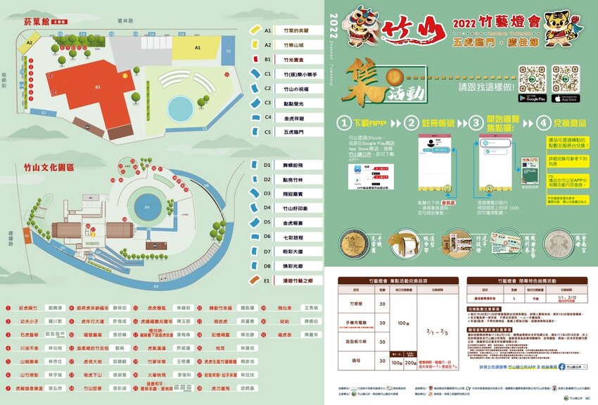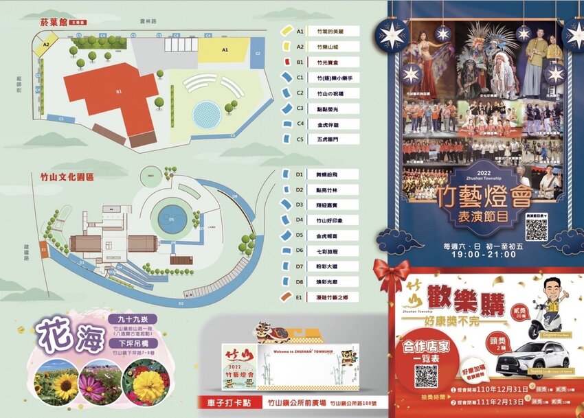 2022竹山燈會「五虎臨門慶佳節」開跑囉!今年的燈會會場比較特別,分為菸葉館與竹山文化園區兩處;魚編特別推薦你們可以直接安排一日遊,從九十九崁花海、鎮公所前模型車打卡點、竹山公園、連興宮、竹山老街到週六下午限定的中山市場竹巢漫步市集,特定店家消費滿百元就能參加竹山歡樂購抽大獎!逛燈會前也別忘了下載竹山鎮公所的APP來集點,好吃好玩又有好禮可以帶回家~