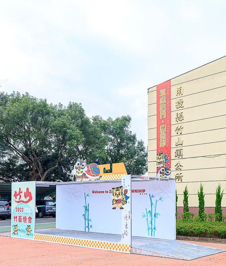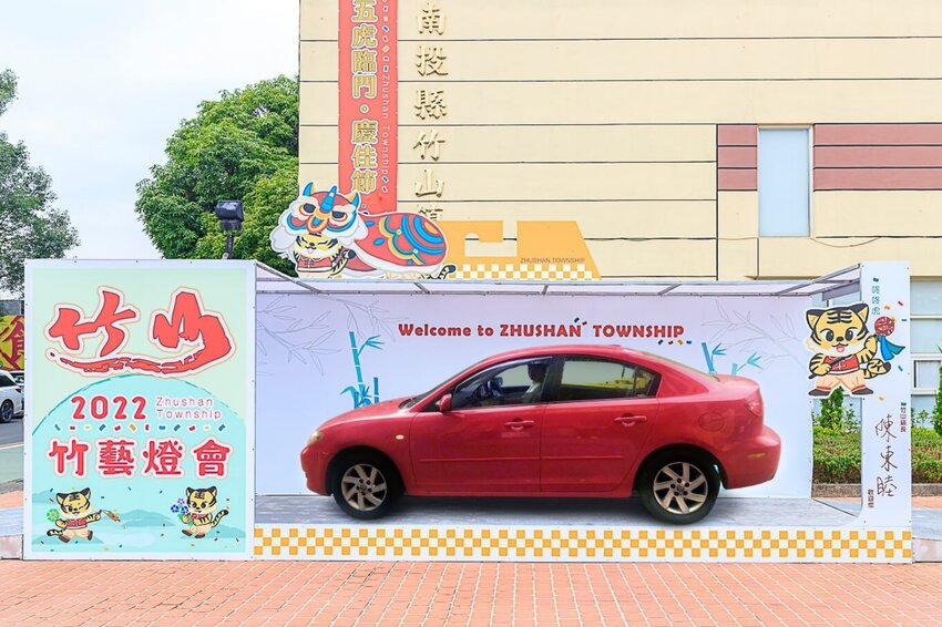 離開竹山九十九崁花海,順著前山路開上來不用五分鐘就能抵達竹山鎮公所,馬上就能看到這座1:1玩具車模型盒,加上又是竹山燈會的主題圖案,可以把車開進去合照留念。