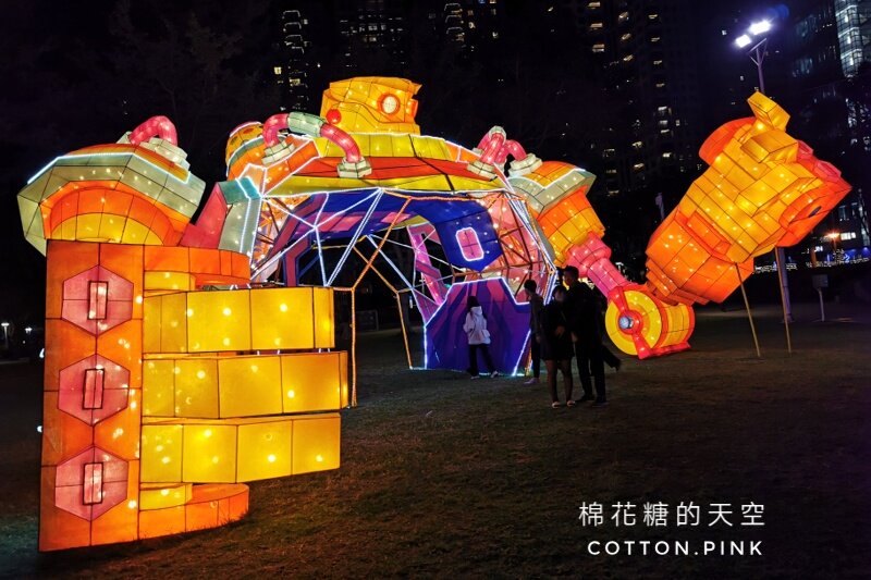 再往前走一點就是超酷的機器人大花燈,而且仔細一看才發現這機器人的頭是會轉動的!阿季拍完照發現跟他四目交接整個下一跳。不只正面很酷~背面也很精緻耶!
