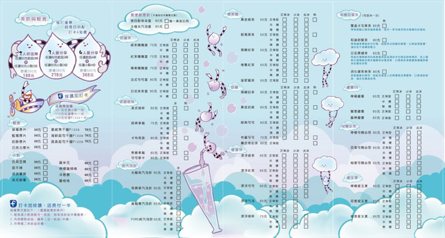 有火鍋、義大利麵、茶飲(奶蓋茶、咖啡、飄浮系列)、輕食(厚片)、小點( 薯條、甜不辣、洋蔥圈 .. )