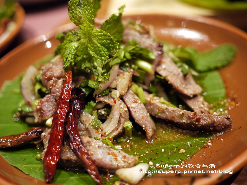 Spicy salad with grilled Thai Northern style pork skin sausage窯烤泰式北部豬皮香腸佐香辣沙拉$95(生菜包香腸以及青蔥洋蔥和花生,很特殊的搭配,好吃,但不知為何他們給的生菜超小片,實在是很難包起來,也推啦)