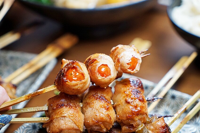番茄豬肉串,番茄吃起來會有爆漿感,微酸甜的番茄嘟嘟好平衡豬五花的油膩,是每次來吾曹不可錯過的招牌之一呢