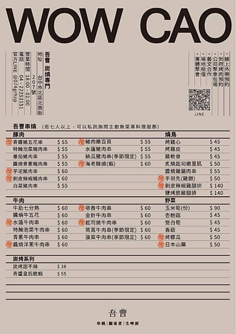 台中太原夜市人氣文青串燒“吾曹炭燒專門“開店囉!!除了延續40種以上創意串燒+獨門醬料,現在還多了日式關東煮、酒水飲料,就在晚上六點開始營業,從晚餐延伸到宵夜場,更是喜愛小酌下的朋友下班後必訪愛店~(未滿18歲請勿飲酒、喝酒不開車、開車不喝酒)