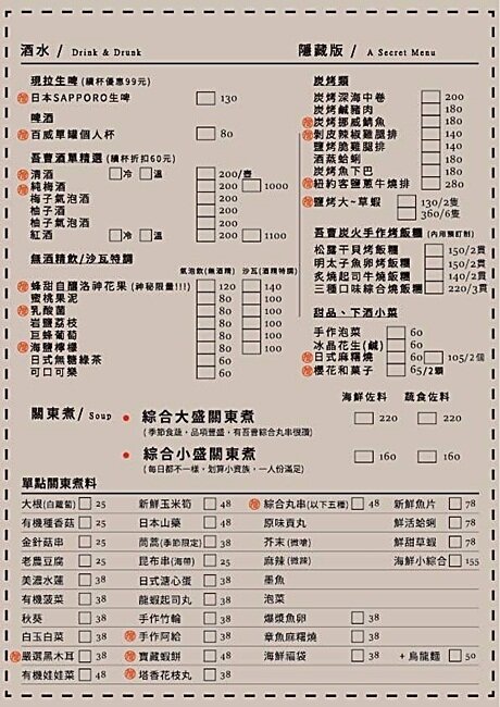 吾曹關東煮、酒水、飲料菜單,每日只要有隱藏版會另外寫入唷!! 除了菜單內的酒水、1.2樓冰箱內還有各式啤酒可挑選,更有吃串燒少不了的生啤酒唷!!想吃的關東煮直接填單再交給店員即可唷!