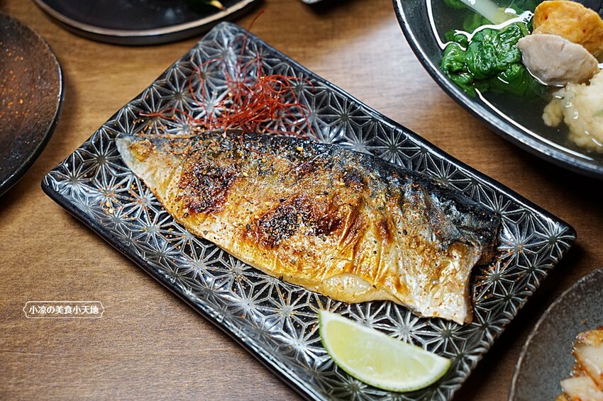 烤挪威鯖魚,現烤的鯖魚油脂豐富,一上桌還能看到那魚皮上的油亮色澤~