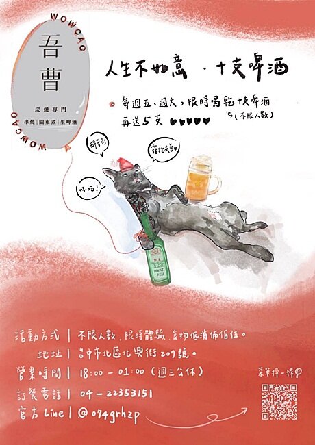 吾曹最新活動:只要每週五、週六、限時(20分鐘)內喝完十支啤酒(不限人數),再送5支啤酒… 你還不來歡樂一下嗎?