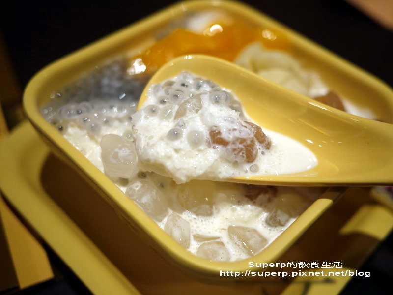 白雪黑珍珠HKD27/約莫台幣102元(友人點的,甜品的名字頗美,組合也特別。這是以椰奶冰為底,就是白雪了,黑珍珠應該就是山粉圓,還加上了其他水果和配料。還不錯,據說是招牌之一,友人每次也都點這道,推!)