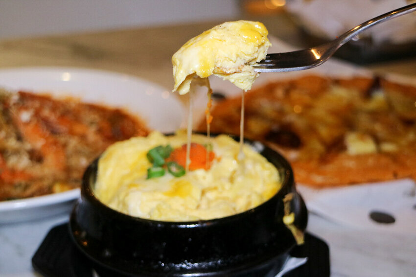 鋪上蔥花和蝦卵,裡頭的蒸蛋鬆鬆軟軟,融合起司綿密濕潤的口感,香濃牽絲太迷人了