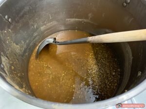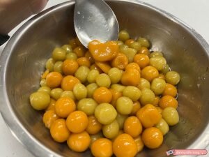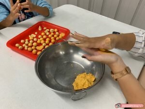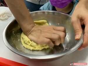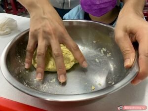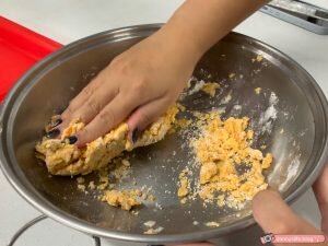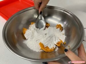 先將地瓜和地瓜粉用湯匙壓扁攪和在一起
