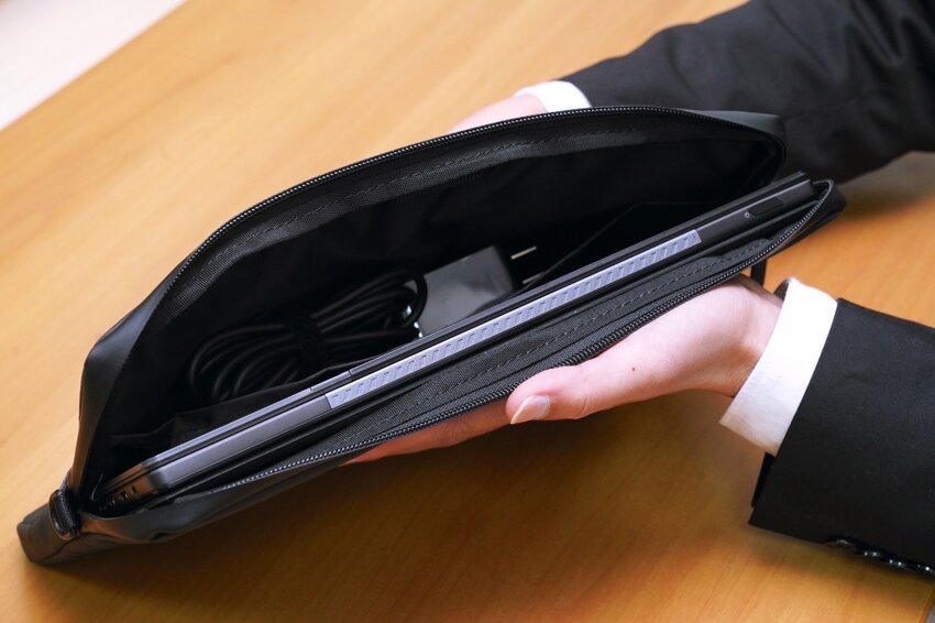 華碩真的很貼心,在你入手 ASUS Vivobook 13 Slate OLED 不用另外買鍵盤、觸控筆等配件外,也不需要額外買防撞包,他們把「酷潮收納包」也附上給你,整台電腦與電源線都可以完整收納進去,並有內袋分隔,也避免了平板螢幕被刮壞的風險。