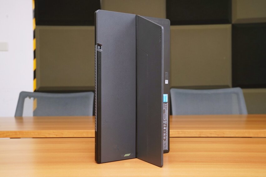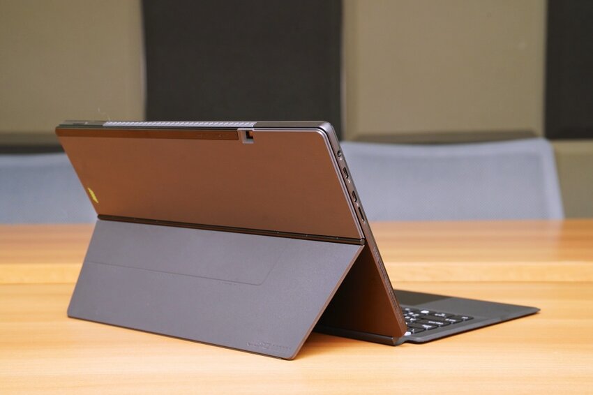 支架保護套同樣為磁吸設計,使用時把右上方的凹口對準 ASUS Vivobook 13 Slate OLED 後方的攝影機磁吸固定住即可融為一體,也不會影響到後鏡頭的使用,材質選用上是硬質的保護套,更耐用。