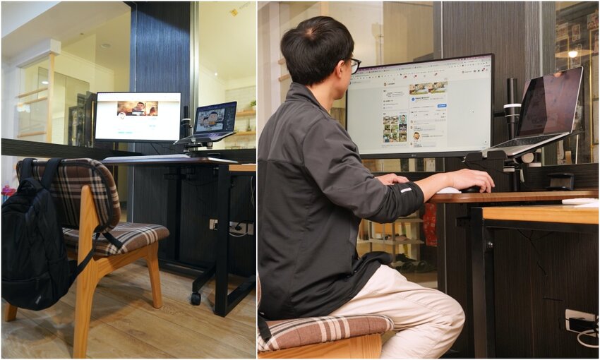 用筆電支架擴充組再裝一台筆電,平時就可用兩台電腦同時操作,一台當主力工作畫面,一台查看臉書通知或開另一頁面/軟體作業,不需要來回切換畫面,在有限的桌子空間也能多工工作。