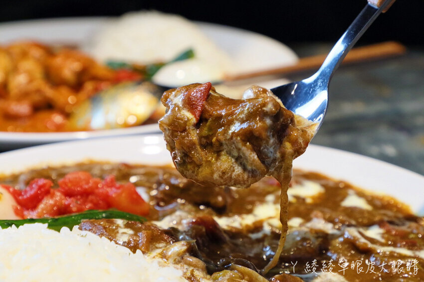 燉牛肋條黑咖哩我的天啊!牛肋條燉跟菇類煮得很軟嫩耶!而且十分入味,特別是娃娃菜化開在咖哩醬中,更增加風味層次!店家獨家自製的黑咖哩超級濃郁,還帶點微辣感!真的是會一口接著一口吃光光耶~提醒大家務必要趁熱吃喔!