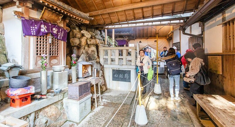 相傳延鎮僧都建寺後的西元811年,弘法大師(空海)到此參拜,看到奧之院後的石壁洞內,有一隻母猴正以石壁中湧出的泉水,為一隻眼睛潰爛的小猿清洗,於是弘法大師便為那隻小猴子祈法連續17天,第18天後小猴子的眼睛突然看得見了,於是泉水能治眼疾的說法不徑而走。當天,有許多民眾拿著水瓶去裝水(無料),據說豐臣秀吉的側室,那個名聞天下的戰國三公主「淀」夫子,便是每天以此水洗臉。就友人說的法,這水喝了對身體也很好。