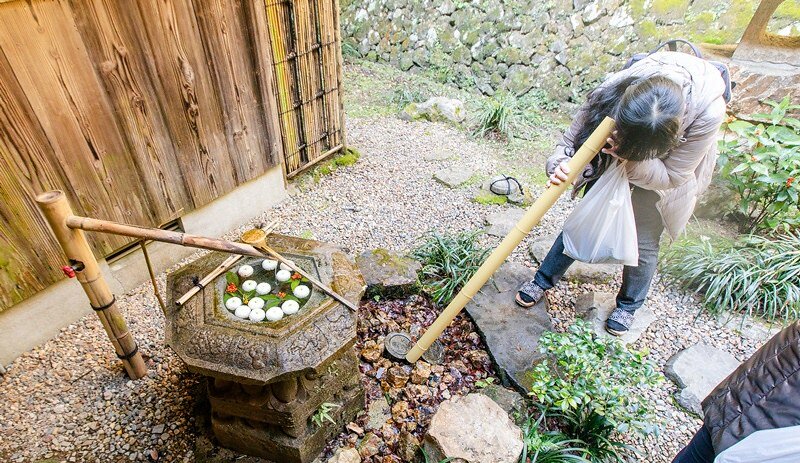 走到這個同樣很美的日式庭園,園前的小手水上放著一支很粗很長的竹筒,寺方人員指意我們把耳朵往竹筒上靠,居然可以清楚的聽到手水舍水滴下的聲音,寺方人員表示其主要的目地是傾聽大自然,圖的是「靜心」兩個字。