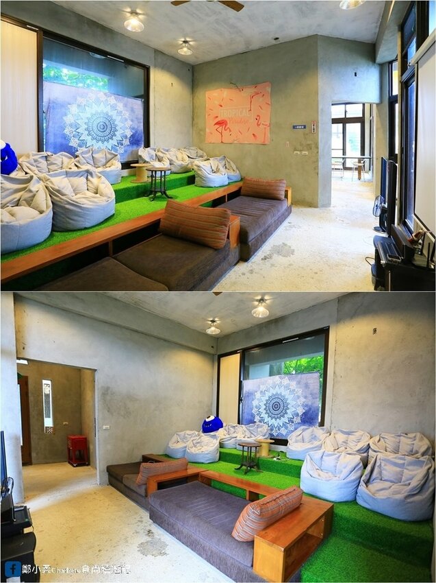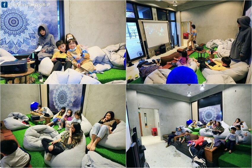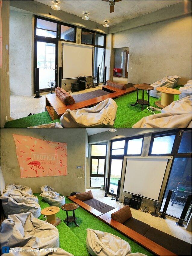 階梯式的設計,提供舒適的懶人椅和沙發座位,超大投影布幕、音響設備都是由營區提供,