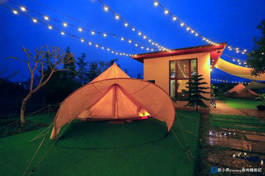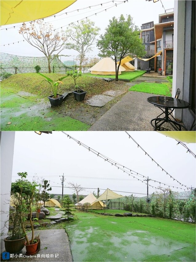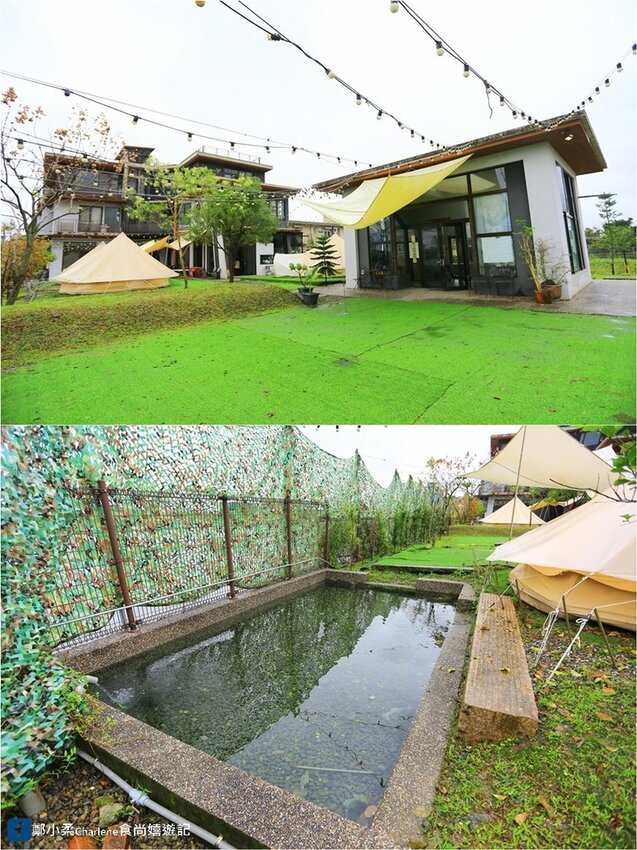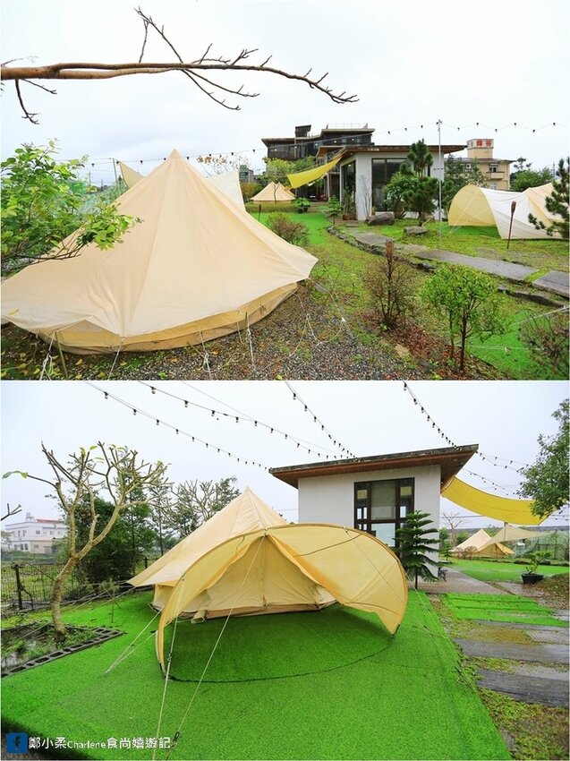 中間隔了一間獨棟娛樂室及草地舞台區,後方設有四個帳篷,營區將帳篷都搭建準備好了,