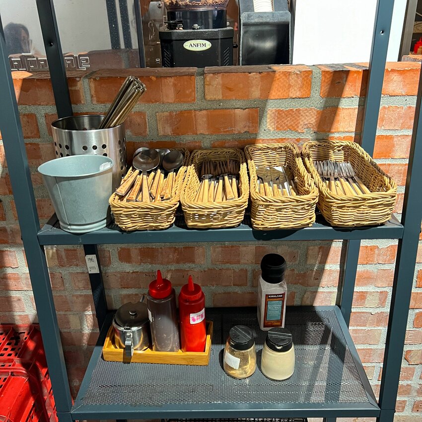 餐具、醬料放在檯子上自取,而享用完餐點,是採自助式回收的,別忘了收拾後放到回收台~