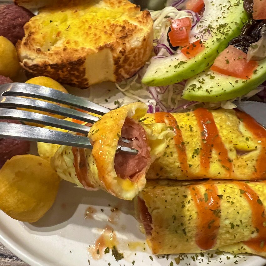 歐姆蛋煎得剛剛好,口感吃起來蠻嫩的,除了熱狗以外,還有起司,吃起來很滿足