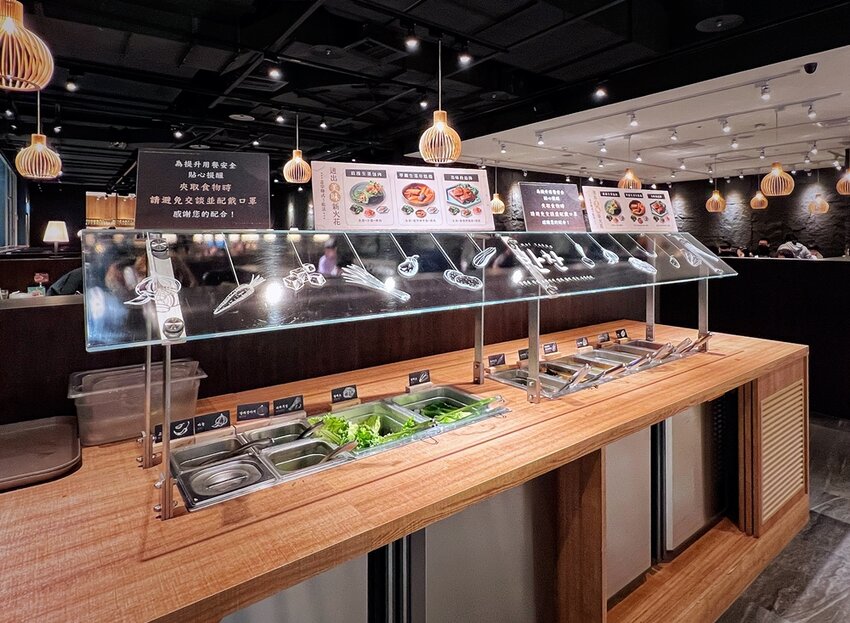 桌與桌之間的設計安排蠻寬敞,用餐時其實不太會互相干擾,這天我們坐在沙發區,整體來說都還保有些隱私,而桌上擺有基本的餐墊紙、餐具、水壺、衛生紙、小垃圾桶等,另外也擺放了基本盤的韓式小菜、包肉生菜等,吃不夠都還可以到自助吧再繼續無限享用。